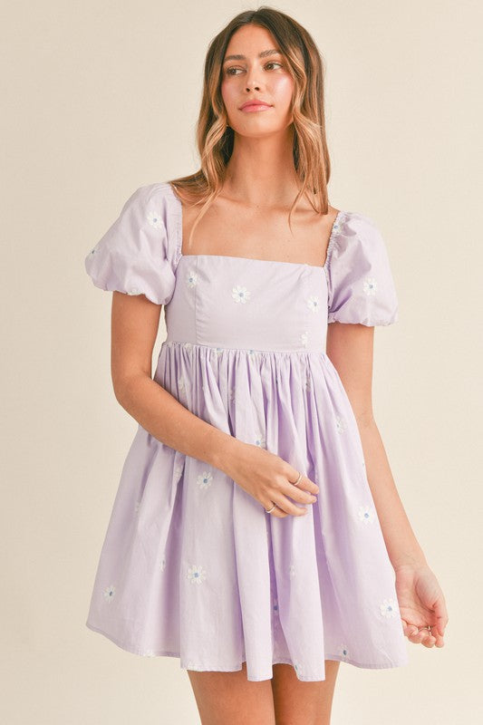 Cotton poplin with embroidered floral detail perfect babydoll mini dress with puff sleeve and smocked back detailing. Lining. Side invisible zipper. SELF: 100% COTTONLINING: 100% RAYON