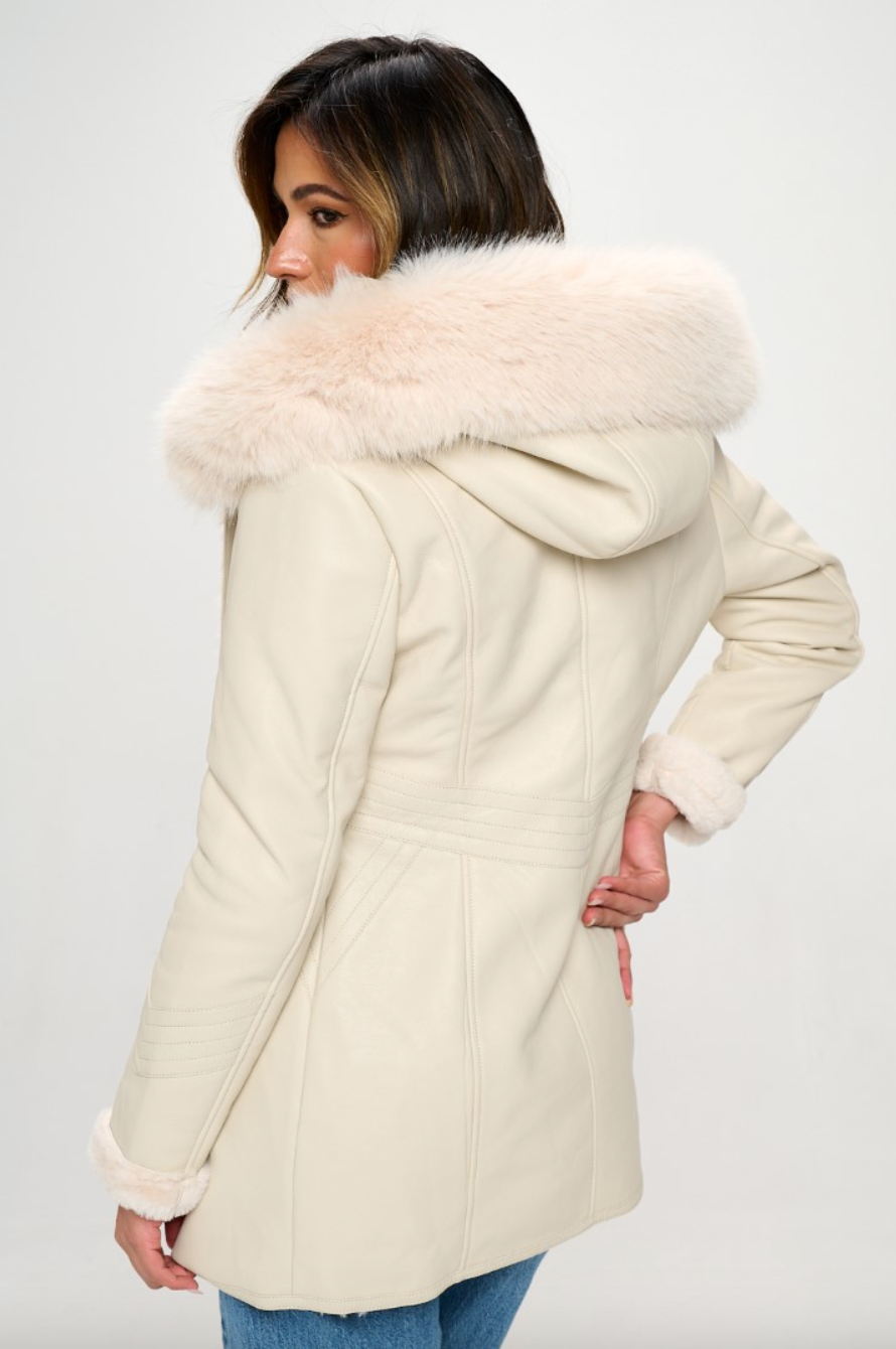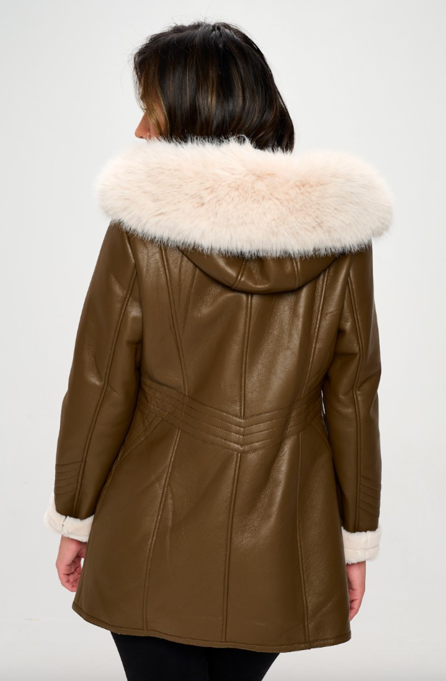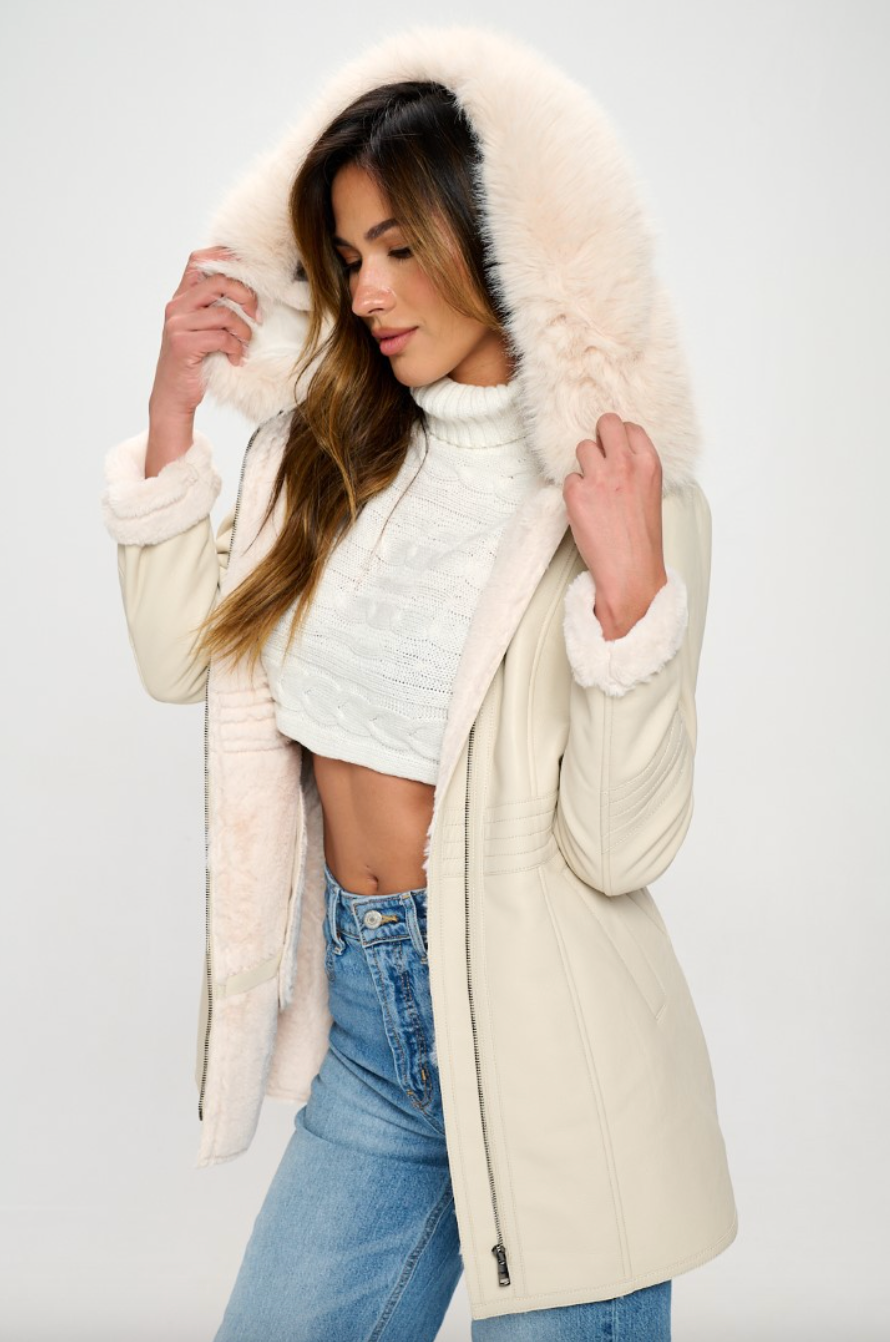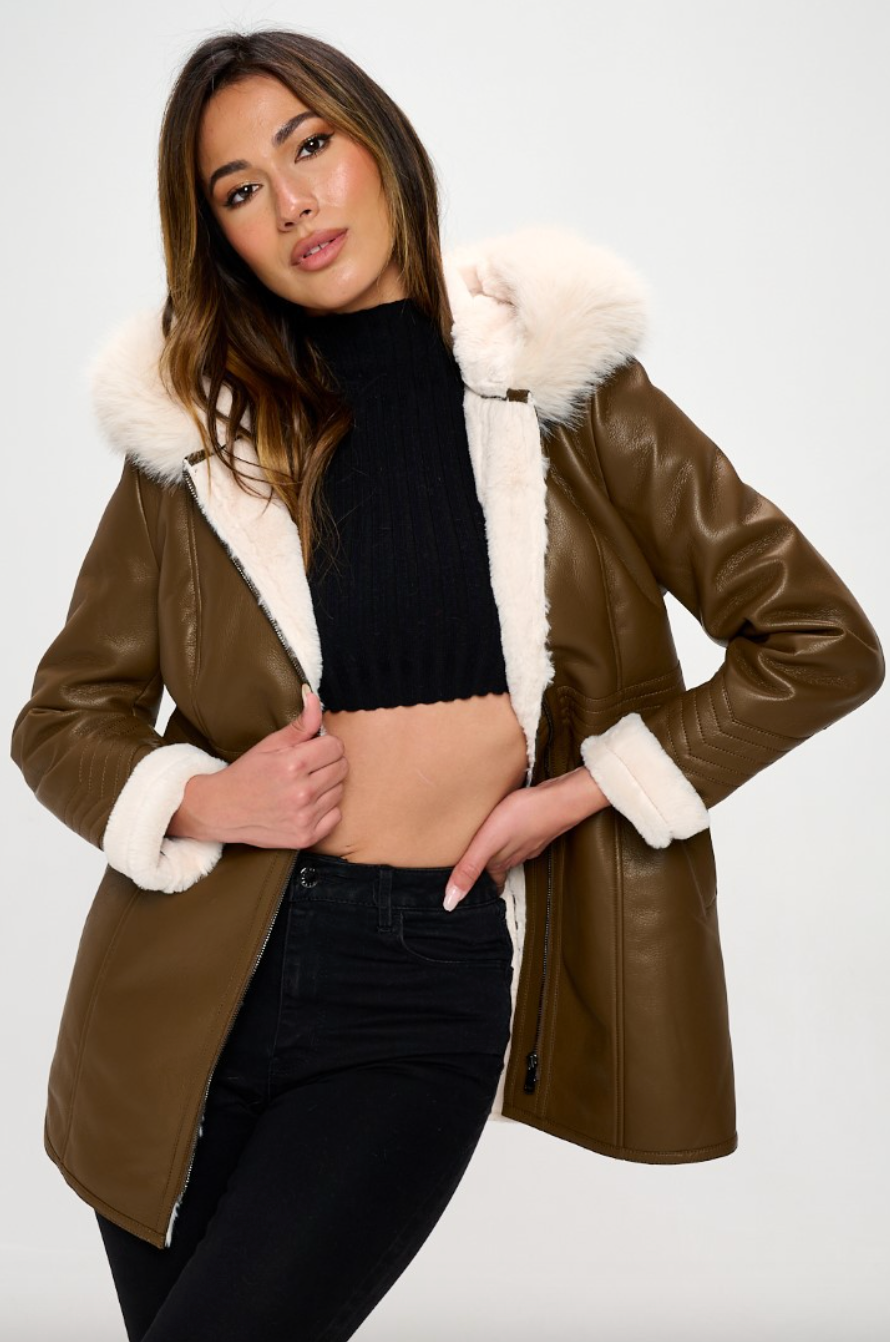 Women's Faux Leather Coat with Sherpa Lining The model is wearing a size small. Please see the size chart for reference DESIGN DESCRIPTION: Faux Leather coat, Hidden side pockets, Sherpa Linning, Hood with Faux Fur detail Closure Types: Zipper Front Closure Fit: Layered Style, True-to-Size Length: Under Hip Color: Black-Black, Camel-Cream, Black-Cream, Cream-Cream Size: S-M-L Occasion: Perfect For Parties, Festival, and Date night Chat with us to order additional sizing