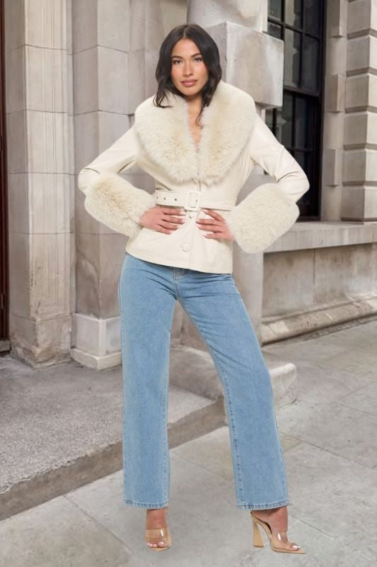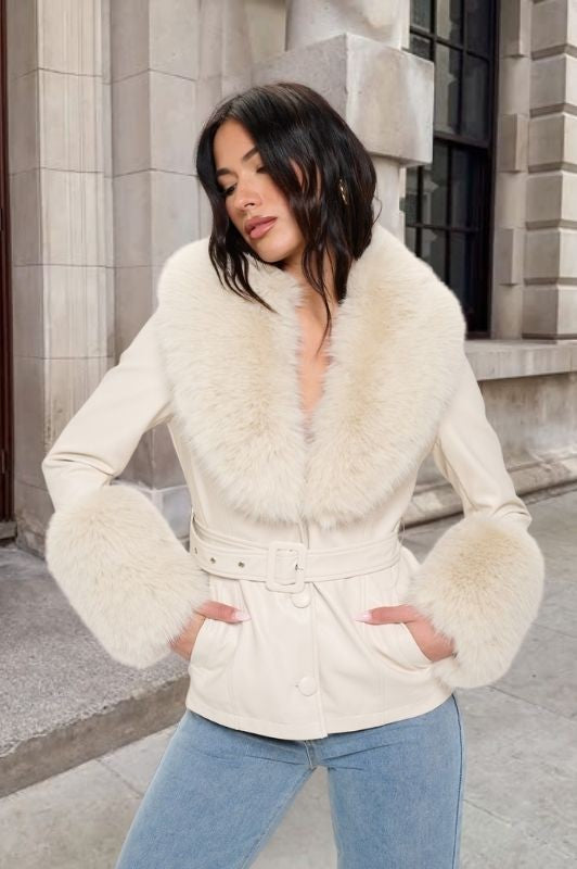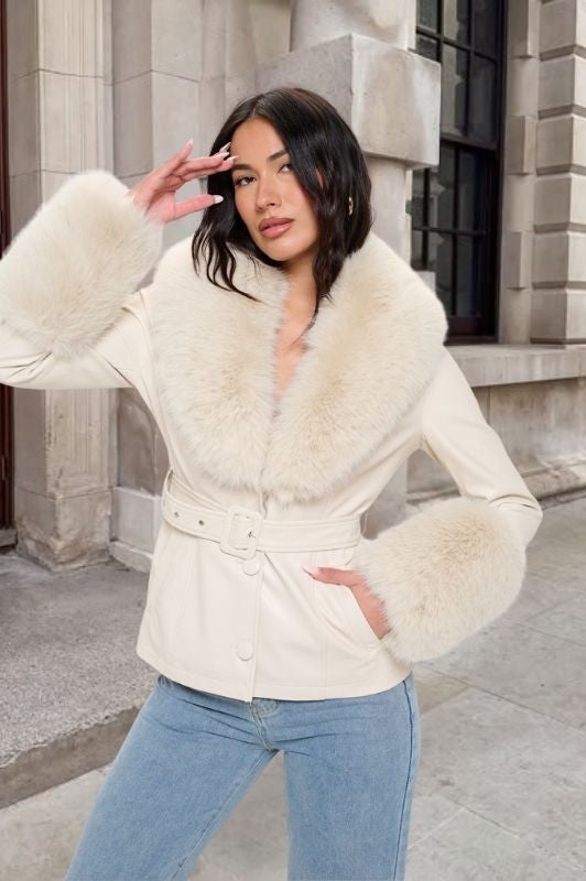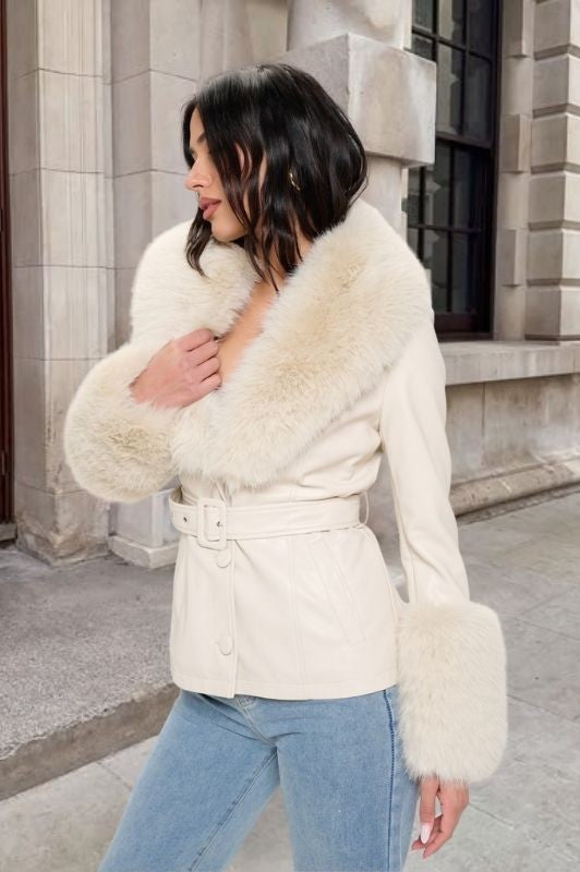 Prestige Vegan Leather Blazer Upgrade your wardrobe with the Prestige Women's Vegan Leather Blazer with Removable Faux Fur Trim. Crafted from premium vegan leather, this tailored blazer features a flattering belted waist and luxurious faux fur accents at the collar and cuffs, which can be removed for a sleek, minimalist look. Designed for versatility and sophistication, this chic piece effortlessly transitions from day to night, making it a must-have statement for any season.