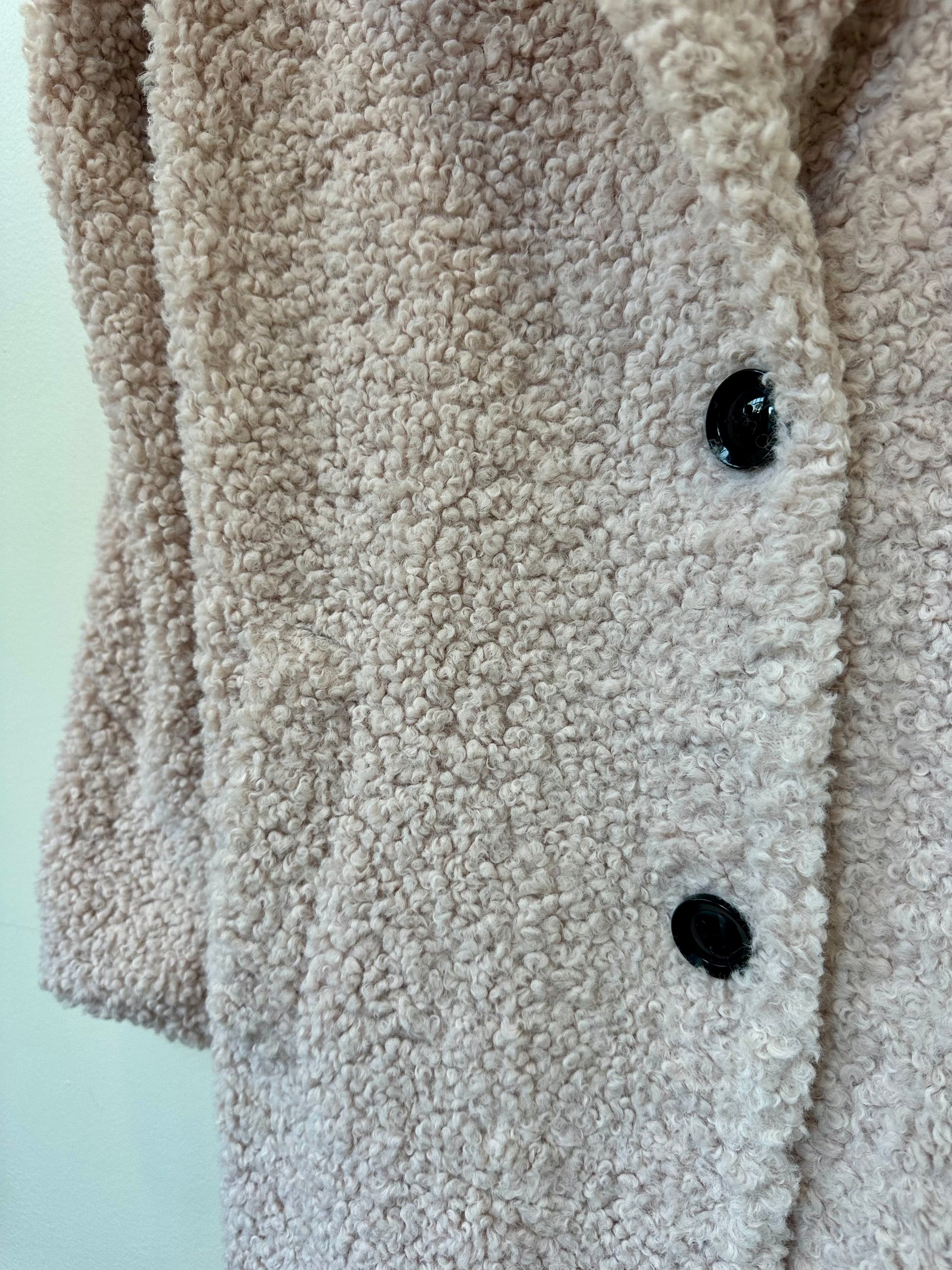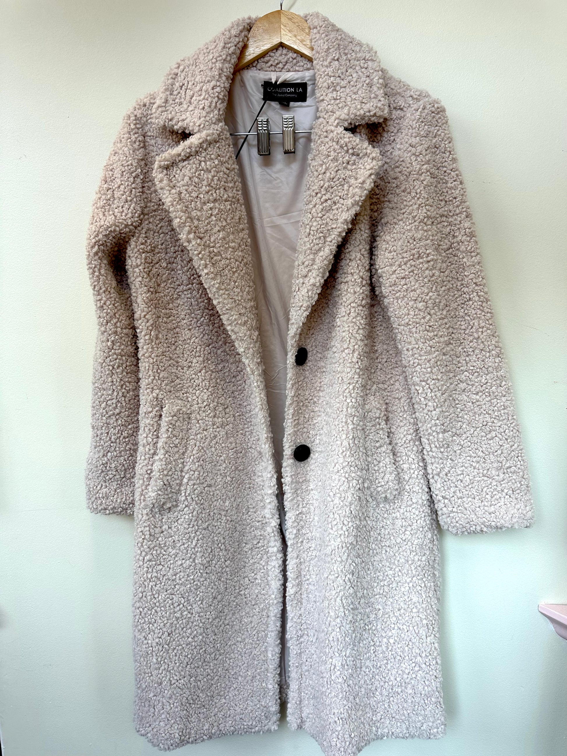The model is wearing a size Small. Women's Teddy Plush Faux Fur Long Coat CLOSURE TYPES: Concealed front button closures. DESIGN DESCRIPTION: Soft Medium Weight Plush Faux Teddy Fur Longline Coat, Notched Lapels Side Slit Pockets, Lined